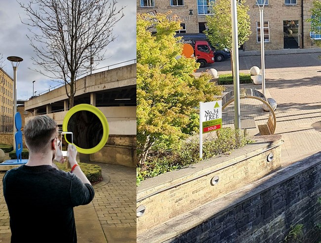 Figure 8 No.34 Tree in Dean Clough Courtyard flagged by a ‘SOLD’ sign. C.Bowe, (2022) The Sold sign as a ‘Digital Doorbell to open a portal to the world of No.34 tree.